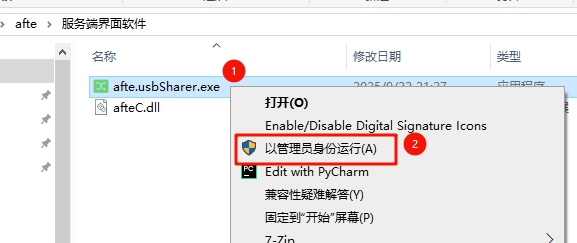 (1)由于“服务端.msi”没有界面,操作不便,所以“服务端界面软件”作为补充,方便设置USB共享。它无需安装,右键以管理员身份运行即可。设置USB共享需要较高的权限,所以需要右键afte.usbSharer.exe选择:以管理员身份运行。