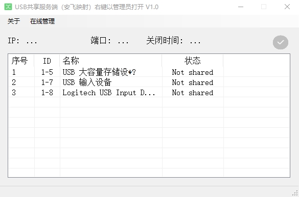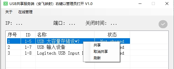 afte.sharer,压缩包中有三款软件,其中“服务端.msi”和"客户端.exe"来自开源的usbipd和USBip。"服务端界面软件"则集成了安飞映射功能和服务端的USB共享操作功能。大白话来说就是插USB的计算机安装"服务端.msi"并使用"服务端界面软件"设置USB共享,需远程共享使用USB的计算机安装"客户端.exe"。