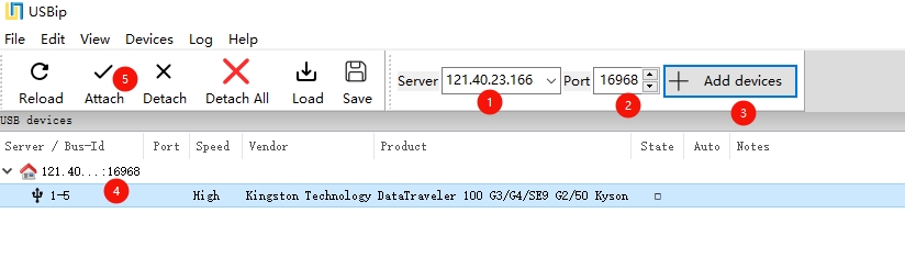 (3)选中需启用的USB,点击:Attach,将在本机显示该USB设备。至此共享OK。