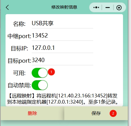 映射服务开启成功后,按钮变为绿色,同时界面显示IP和端口号,将在客户端中使用。注意保密该端口号。